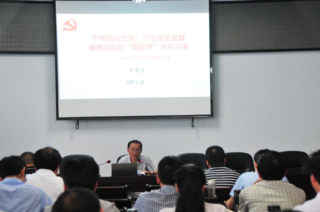 学院纪委书记李高东应邀作主讲,首先,他带领与会领导干部观看随州职院《清风培心 廉耕育人》专题片,然后以《严明党纪法规、自觉接受监督,做推动实现“随职梦”的担当者­——深入学习纪律处分条例和监察法规》为题,主要阐述了《中国共产党纪律处分条例》的发展历程、基本架构、特点,重大意义,深刻解读了《监察法》,指出了制定监察法的重要意义、起草过程、指导思想、基本思路和主要内容,并结合学院实际工作中的鲜活案例详细解读了政治纪律、组织纪律、廉洁纪律、群众纪律、工作纪律和生活纪律的要点,指出贯彻落实中需要关注的重点问题,为全体与会干部上了一堂生动的党风廉政教育课。