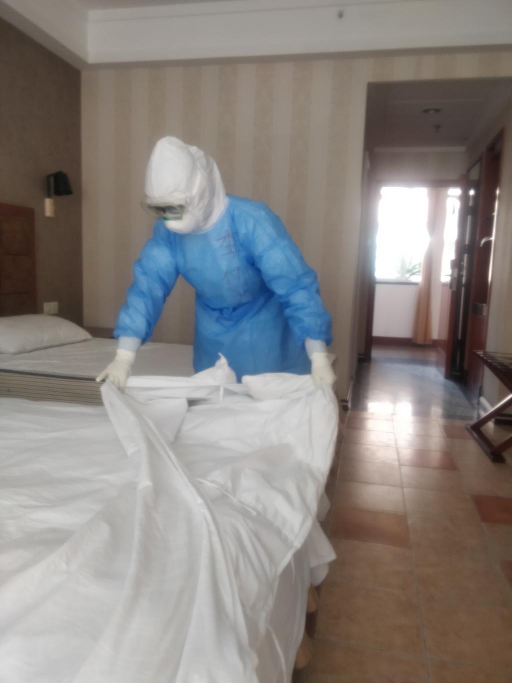隔离点中的病人,每天都有转院和入院的,转走后的病房要及时进行酒精消毒、紫外线消毒,接病人一天当中,可能随时都会有病人来,晚上也是一样。有的一家人中只有一个人隔离,有些病人已经入院很多天依然没有好转的,院方就会要求其家人一起隔离,很多患者非常着急、担心,同时也不理解,工作需要很多的耐心。