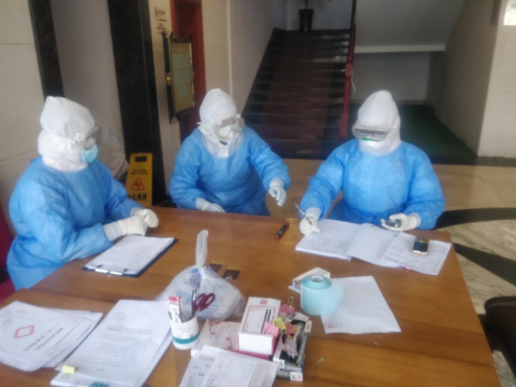 三位同学在带教老师的带领下,工作重心还是在隔离点里面,每天和同事们一起接待病人,每当新病人入住,她们会根据每个病人的情况进行分类分区;在病人来之前会准备好他们的生活用品,病人到达后再发一张知情书,上面除了一些基本注意事项之外,还会增加一个工作电话号码。因为是隔离点污染区,给病人消完毒,让病人回房间,定期测量记录体温;这期间病人如果没有接到通知说要出院或转院,就用电话跟医护人员联系,她们要及时听取病人主诉,与医生沟通后,执行正确的处置。