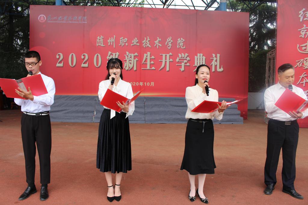 开学典礼在庄严的国歌声中开始,全体师生起立共同歌唱国歌。随后,6个二级学院新生代表上台,学校领导为新生代表佩戴校徽,随后2019级护理专业学生徐燕和2020级土木工程与建筑工程学院学生黄浩澜分别作为老生、新生代表发言。