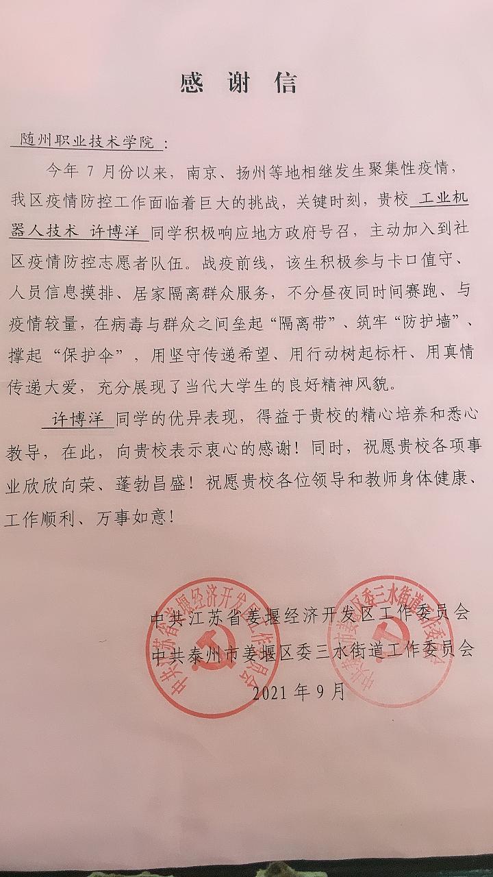 9月11日,正值开学新生报到,我校收到一份江苏省姜堰经济开发区工作委员会和姜堰区委三水街道工作委员会的感谢信,感谢我校2021级工业机器人专业新生许博洋同学在南京发生疫情期间积极参与当地疫情防控工作。