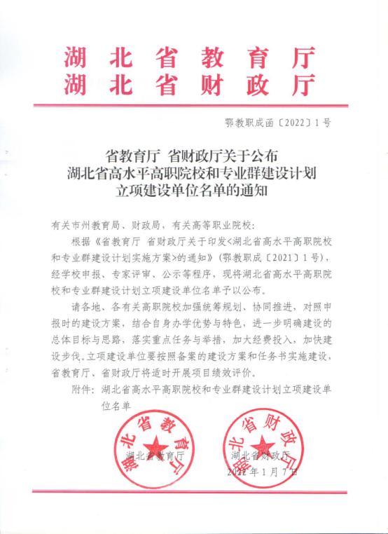 2022年1月7日,湖北省教育厅、湖北省财政厅发布《关于公布湖北省高水平高职院校和专业群建设计划立项建设单位名单的通知》(鄂教职成函〔2022〕1号),随州职业技术学院以汽车制造与试验技术为核心龙头的专用汽车制造专业群获批湖北省高水平专业群A类立项建设项目,标志着我校专业建设综合水平再上新台阶。