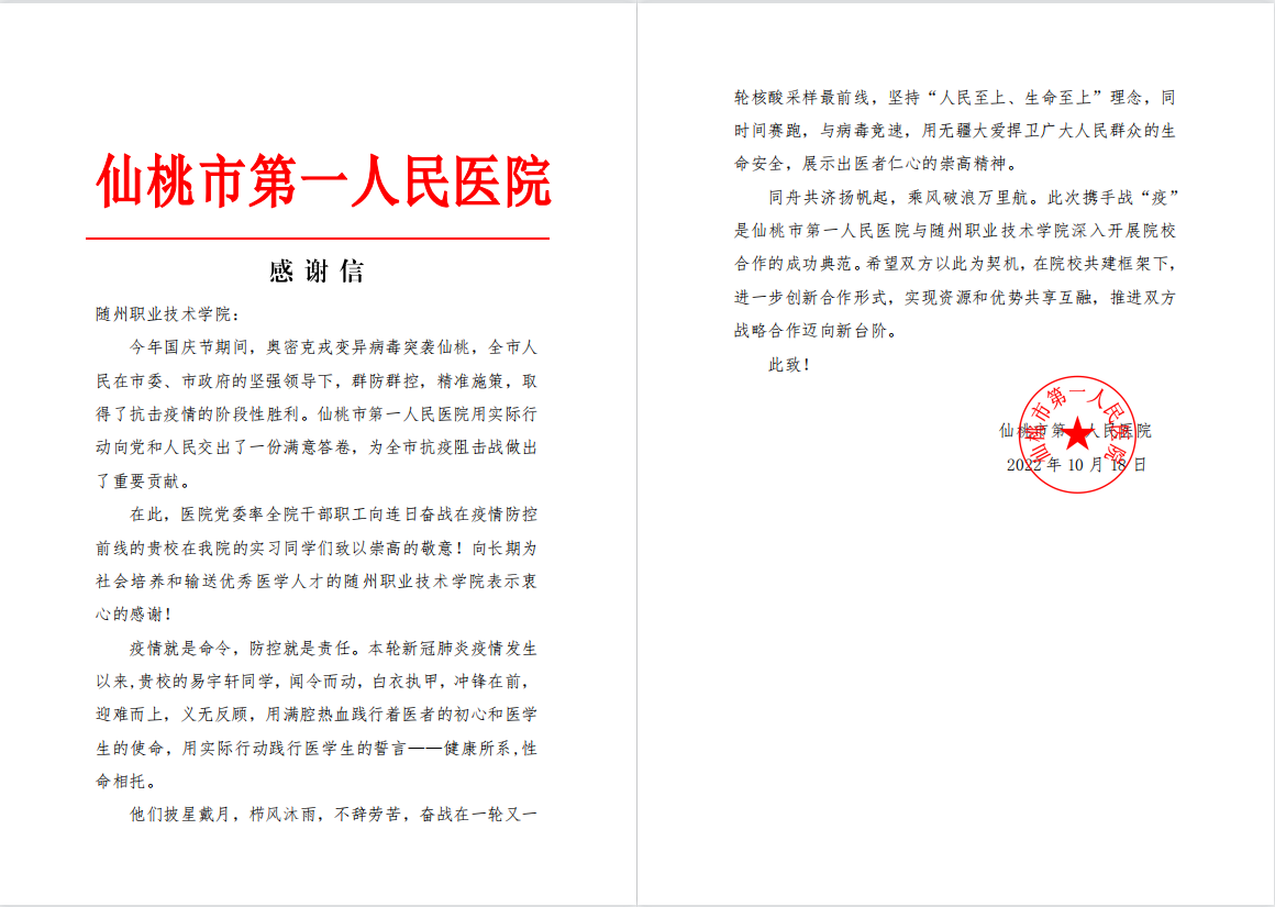 近日,我校收到仙桃市第一人民医院的一封感谢信,信中对奋战在疫情防控前线的我校医学院2020级临床1班的易宇轩同学表达了感谢,同时向长期为社会培养和输送优秀医学人才的随州职业技术学院表示衷心的感谢!