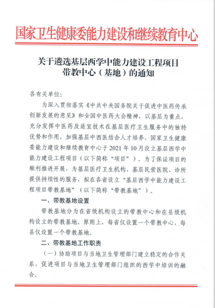 基层西学中能力建设工程项目,是国家卫生健康委能力建设和继续教育中心为了深入贯彻落实《中共中央国务院关于促进中医药传承创新发展的意见》和全国中医药大会精神,以基层为重点,充分发挥中医药及适宜技术在基层医疗卫生服务中的独特优势和作用,加强基层中西医结合人才培养,而专门设立的。