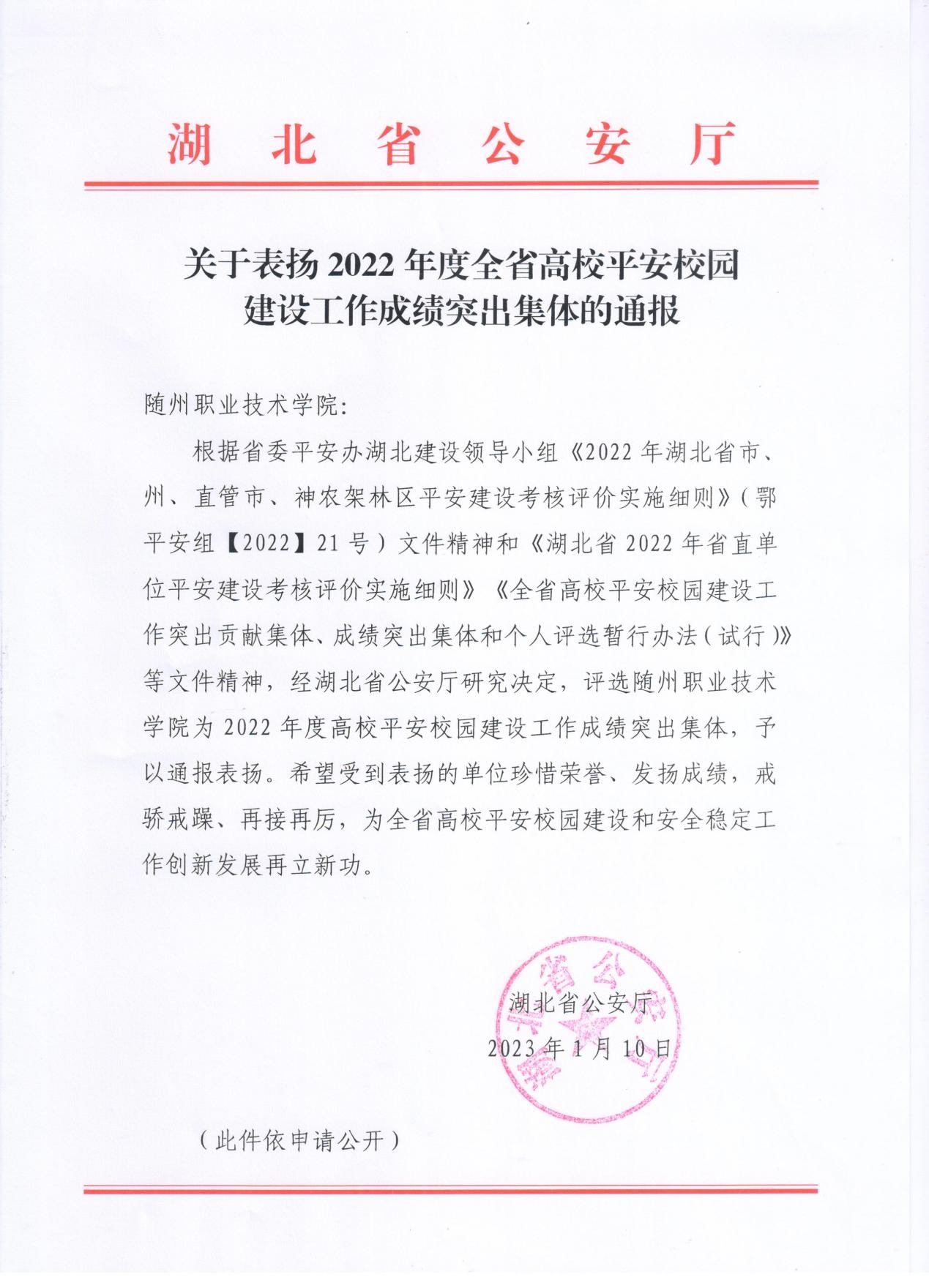 近日,随州职业技术学院收到省公安厅通报,2022年“全省高校平安校园建设工作成绩突出集体”评选揭晓,随州职业技术学院获此项表彰。