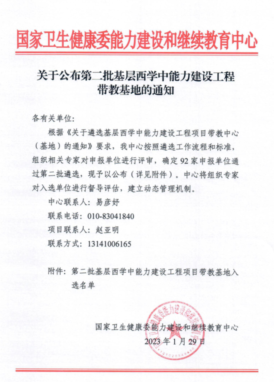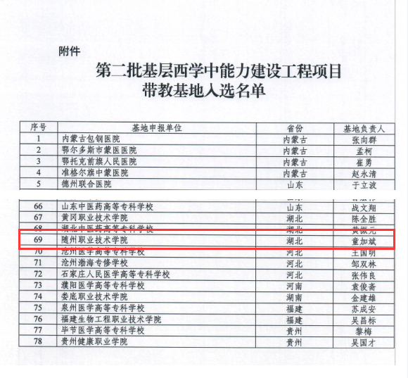 近日,国家卫生健康委能力建设和继续教育中心下发《关于公布第二批基层西学中能力建设工程带教基地的通知》,随州职业技术学院经过前期申报评审,成功入选第二批国家级基层西学中能力建设工程项目带教基地名单。