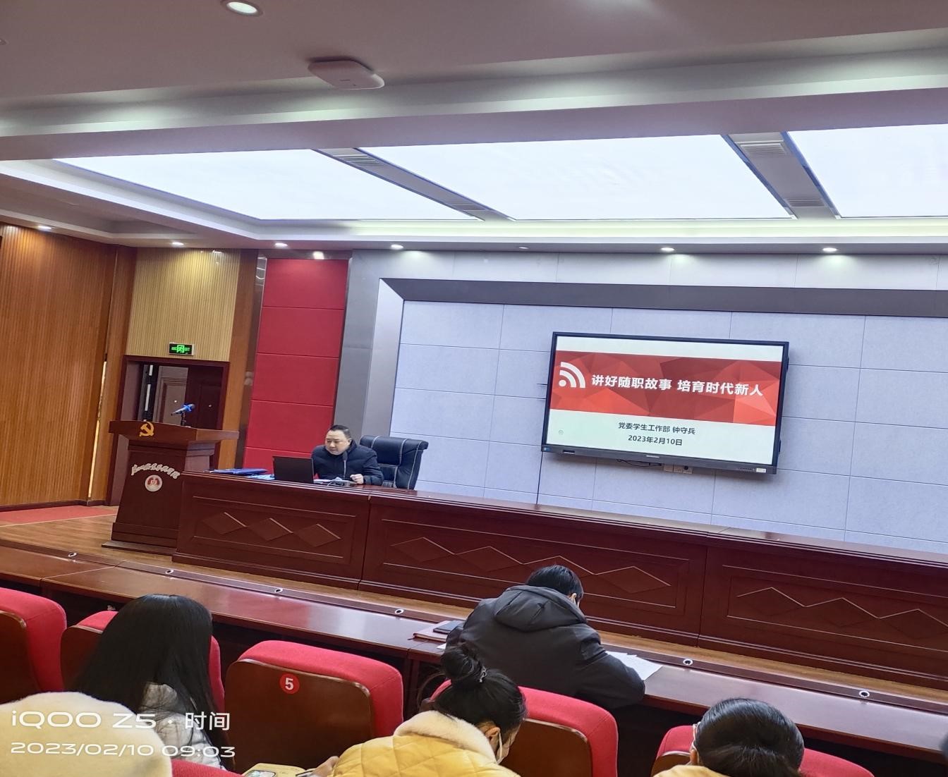 会上,学生工作处处长钟守兵以《讲好随职故事培育时代新人》为主题,以一线辅导员典型工作案例为切入点,展现育人“小故事”中的学生教育服务管理“大学问”。希望全体学工人员要根据学生群体和形势的变化,不断调整、优化学生教育管理服务方式,要因事而化、因时而进、因势而新,提高思想政治工作科学化、精细化、精准化水平,不断提升育人实效。