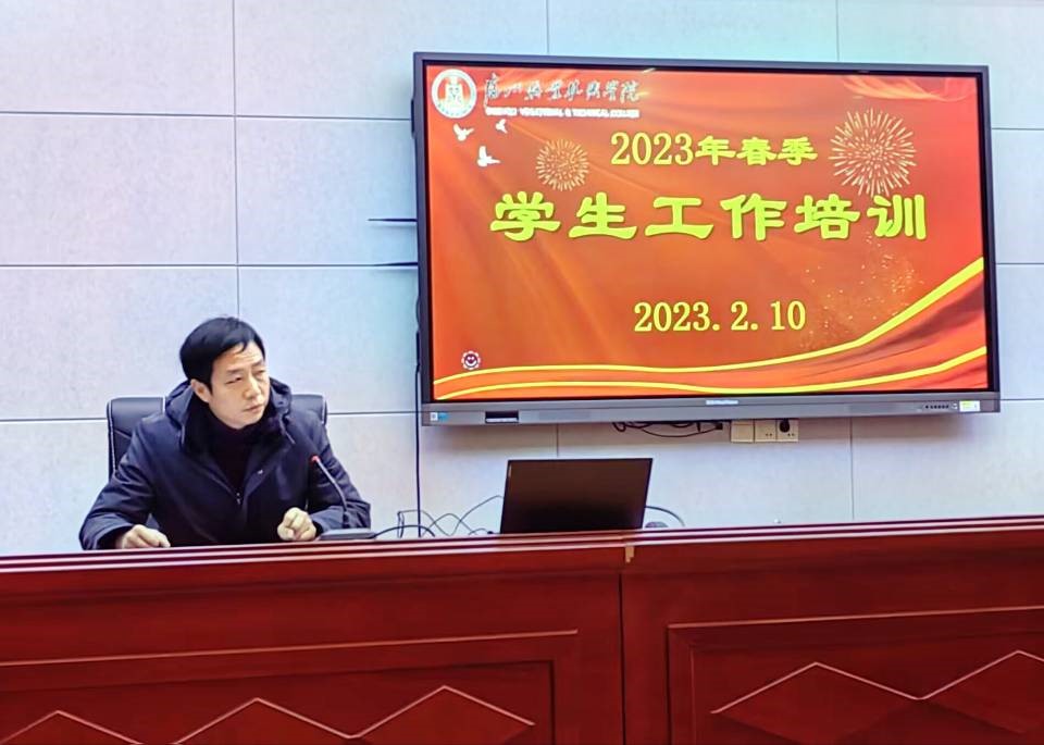 为进一步提高辅导员职业技能和工作水平,推动辅导员职业化、专业化发展,做好春季学期学生教育管理工作,2月10日上午,我校在学术报告厅召开2023年春季学生工作培训会。校党委委员、副校长邹厚亏出席会议并讲话。学工处、保卫处、合作办学处、团委、中专部全体人员及各二级学院党总支书记、院长、副书记、学工办人员及全体专兼职辅导员参加会议。