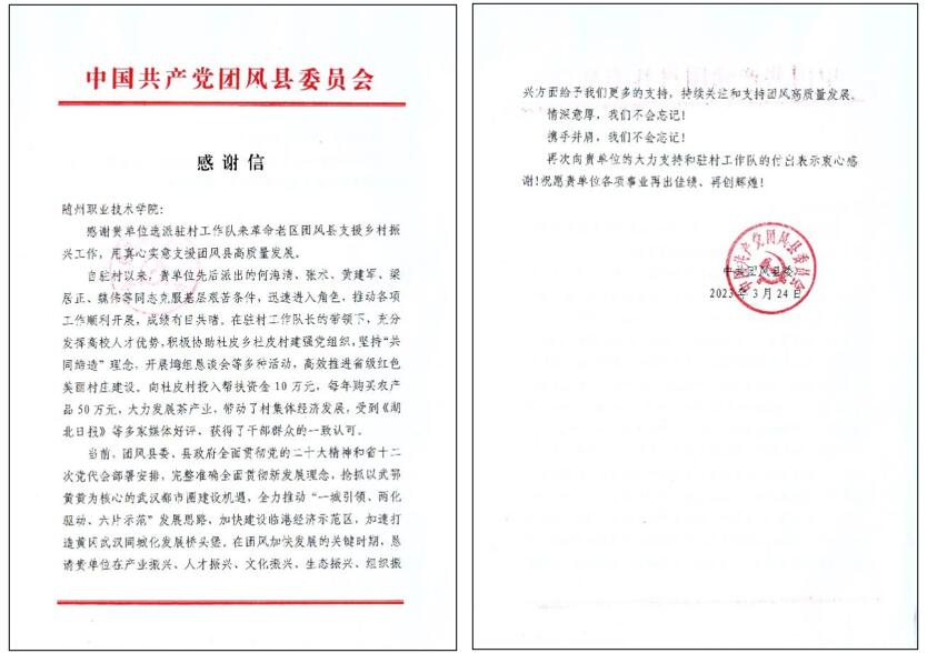 近日,我校收到黄冈市团风县委的感谢信,感谢我校在乡村振兴工作中的无私奉献,真心实意支援团风县高质量发展。