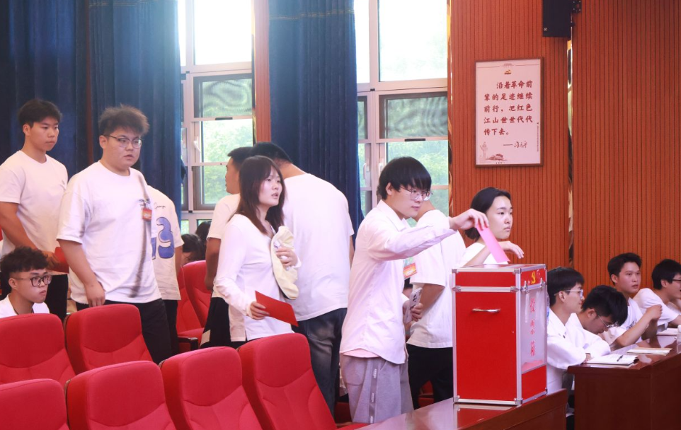 在会议的第二阶段,与会师生通过差额选举,从7位候选人中选出了文俊熙、张慧慧、徐艺朵、祝小航、李子恒等5位同学担任第六届学生会主席团成员,新产生的第六届学生会主席团成员在会场宣誓就职。