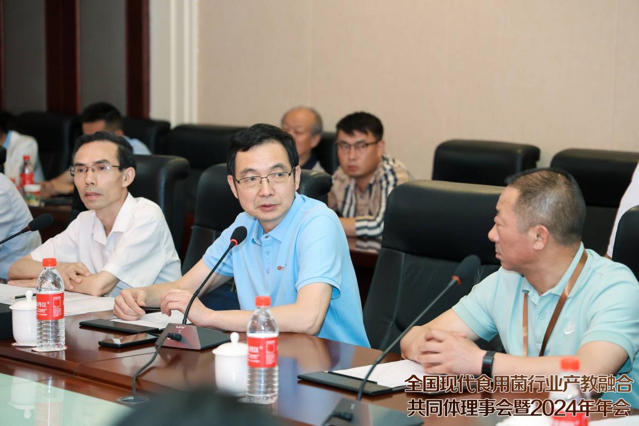 湖北裕国菇业股份有限公司董事长雷于国作为企业代表发言,雷于国董事长介绍了公司的基本情况以及在产教融合方面取得的可喜成绩。他表示,湖北裕国菇业股份有限公司发展至今,科技创新扮演了很重要的位置,公司将持续践行产教融合共同发展,从科技创新的土壤中汲取营养,助力食用菌产业健康发展。他指出,香菇产业从当初的初级农产品,发展到现在集生物技术、精深加工、智能装备等多领域于一身的高端产业,作为随州新质生产力典型代表,离不开科技创新的助力,更离不开领导们的大力支持。相信在产教融合共同体的不懈努力下,随州香菇定将再创佳绩。