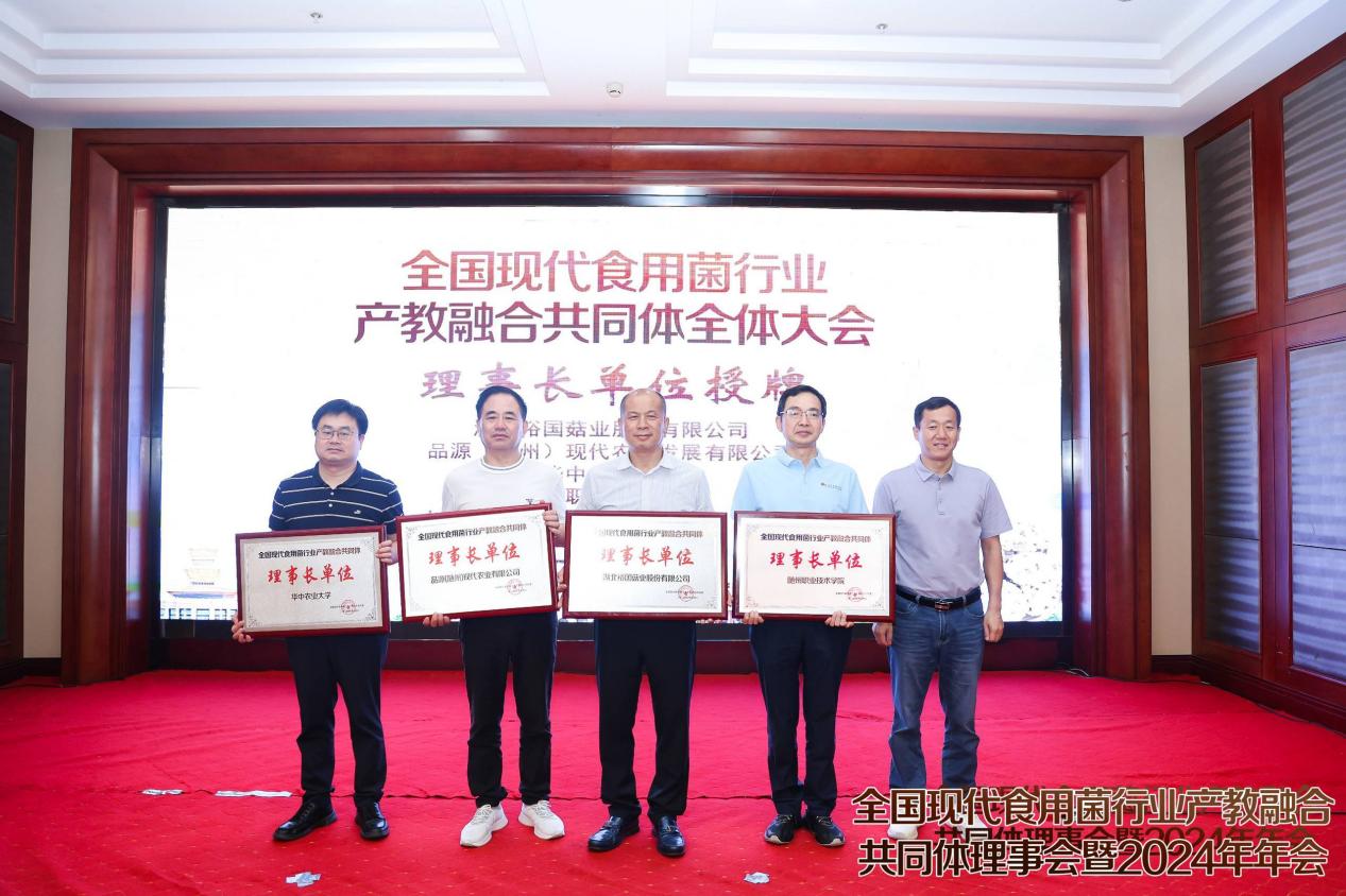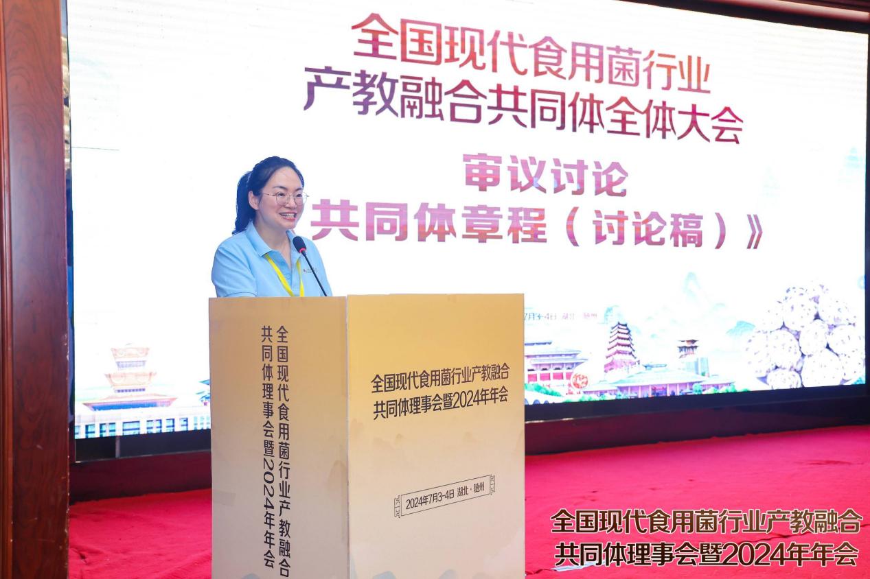 开幕式结束后,随即开始了全国现代食用菌产业产教融合共同体全体大会。首先由随州职业技术学院香菇学院党支部书记吴冉冉宣读《共同体章程(讨论稿)》,讨论稿以举手表决的形式审议通过。然后以举手表决的形式通过了理事长单位名单、副理事长单位名单、理事单位名单,并现场进行了授牌。大会通过湖北裕国菇业股份有限公司、品源(随州)现代农业发展有限公司、华中农业大学、随州职业技术学院共4家理事长单位,通过包括易菇网在内的12家副理事长单位,16家理事单位。此外还有多家会员单位,会员单位可作为理事单位候选,申请理事单位,于下届理事会时进行审议。