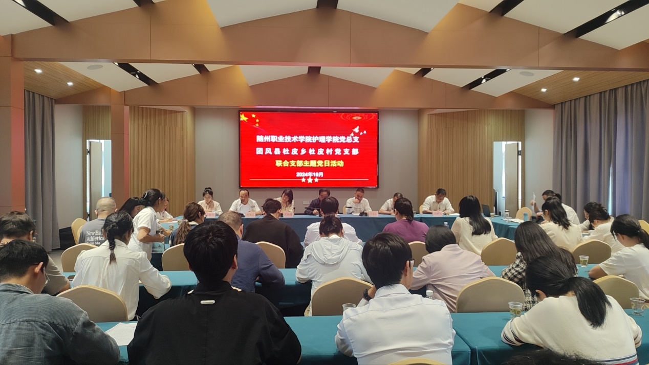 10月11日,随州职业技术学院护理学院党总支联合团风县杜皮乡杜皮村党支部,在杜皮乡党校开展10月支部主题党日活动。学校党委委员、副校长梁学军,护理学院党总支全体党员、学生入党积极分子,驻村工作队全体成员,杜皮乡杜皮村“两委”成员及党员共50余人参加活动。