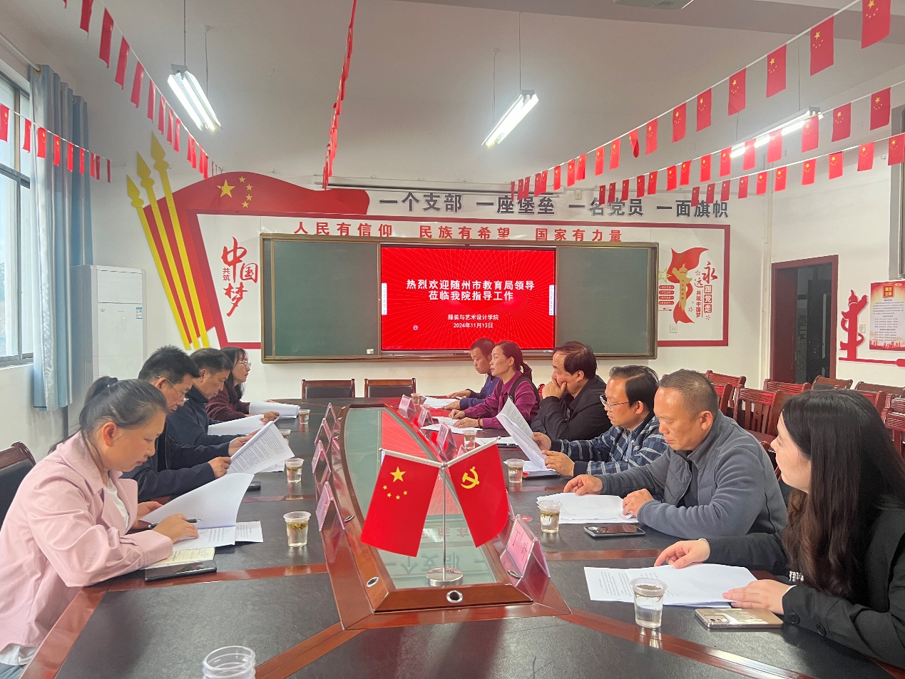 11月13日,随州市教育局副局长石正东、随州市教育科学研究院院长祝瑾一行来我校服装与艺术设计学院调研指导工作。校党委委员、副校长梁学军,教务处处长黄达等接待调研。
