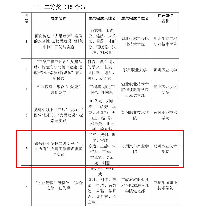 近日,从湖北省高职高专院校党建研究会传来喜讯,我校专用汽车与应急产业学院党总支报送的《高等职业院校二级学院“五心五育”党建工作模式研究与实践》荣获首届党建工作成果二等奖。