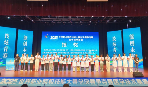 金秋时节传捷报,杏林学子竞风流。近日,2025年世界职业院校技能大赛总决赛争夺赛医学技术赛道在信阳职业技术学院圆满收官,来自全国的130余支参赛队伍齐聚赛场,展开激烈角逐。我院临床医学专业学子付豪、张锦剑、王玉婷、欧阳璇组成的参赛团队,在医学院院长冯丽带队下,以卓越的专业实力从众多强手中突围,斩获银奖。