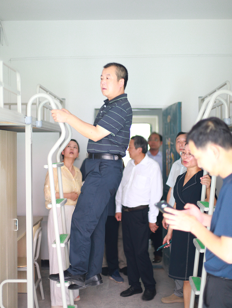 学校党委书记马大奎登上扶梯查看寝室升级改造情况
