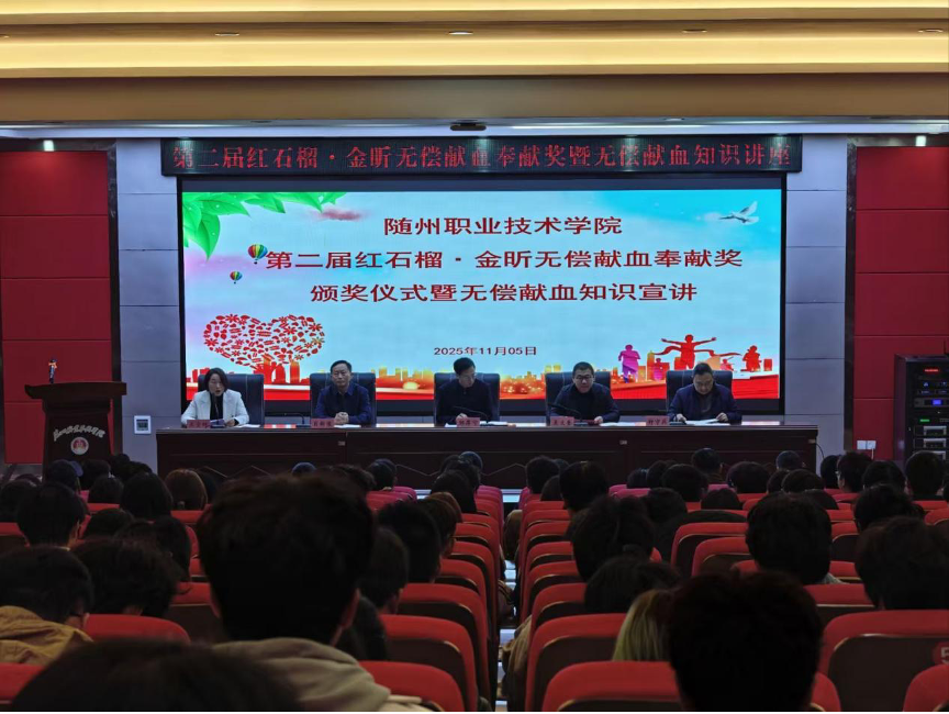 11月5日下午,随州职业技术学院在学术报告厅举行第二届“红石榴·金昕无偿献血奉献奖”颁奖典礼暨无偿献血知识宣讲活动。学校党委委员、副校长邹厚亏,随州市中心血站副站长吴大奎,党委宣传(统战)部、学生工作处、校团委等部门负责人,各二级学院党总支副书记、团总支书记,15名受表彰学生及无课班级学生代表参加活动。
