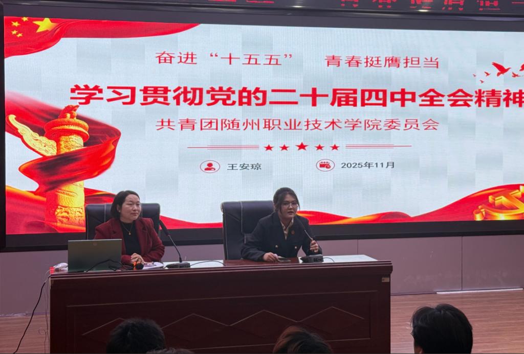 宣讲结束后,校团委随即组织第八期校级“青年马克思主义者培养工程”培训班学员及校级学生组织骨干召开学习交流会。会议集中学习了《中共随州职业技术学院委员会关于做好党的二十届四中全会精神学习宣传工作的通知》精神,并就全校各级团组织、学生组织深入学习宣传贯彻全会精神作出部署。会议要求,要通过主题团日、主题班会等形式实现学习全覆盖;“青马班”学员要组建“00后”学生宣讲团,深入各二级学院开展巡回宣讲,推动全会精神入脑入心、走深走实,切实激发广大青年的责任意识与使命担当。