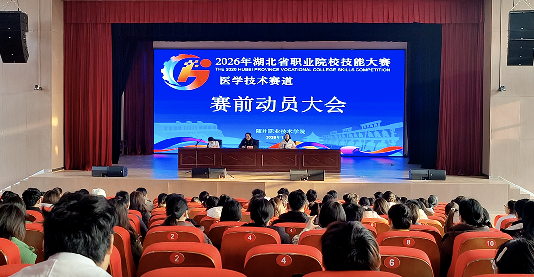 为全力保障2026年湖北省职业院校技能大赛医学技术赛道承办工作顺利开展,1月13日,随州职业技术学院在同根报告厅召开赛前动员大会。学校党委委员、副校长梁学军出席会议并讲话,教务处处长杨芳、医学院院长冯丽及各工作组全体成员、学生志愿者代表参加大会。