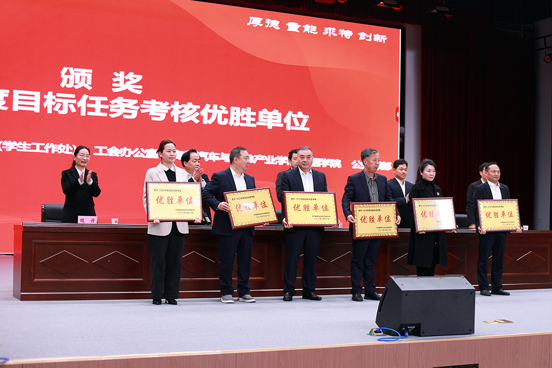 会上,梁学军宣读《中共随州职业技术学院委员会关于2025年度目标任务考核情况的通报》;校领导为获得2025年年度目标任务考核的6个优胜单位进行颁奖;曾庆东代表学校与资产管理中心、服装与艺术设计学院现场签订2026年度目标任务考核责任书。