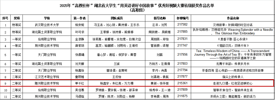 近日,2025年“高教社杯”全国大学生“用外语讲好中国故事”优秀短视频大赛结果揭晓。由我校公共课部教师黄鑫、张华丽指导,2024级建筑工程技术专业学生杨鑫宇、单千红、朱红亮、万力墁共同创作的作品《走进九口堰 红色足迹印初心》荣获湖北省二等奖。