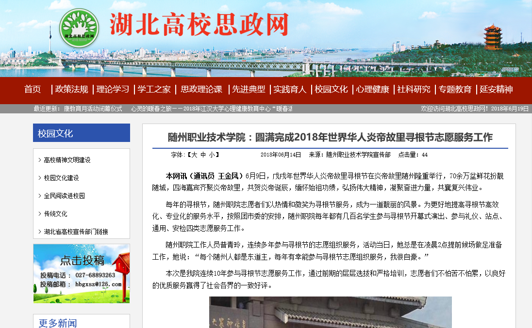 上一条:湖北教育新闻网:随州职院发布《服务随州贡献度报告(2002-2017)》